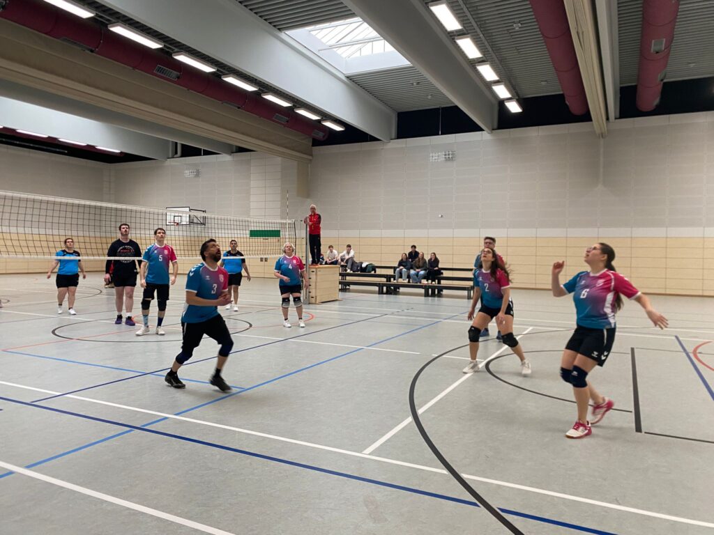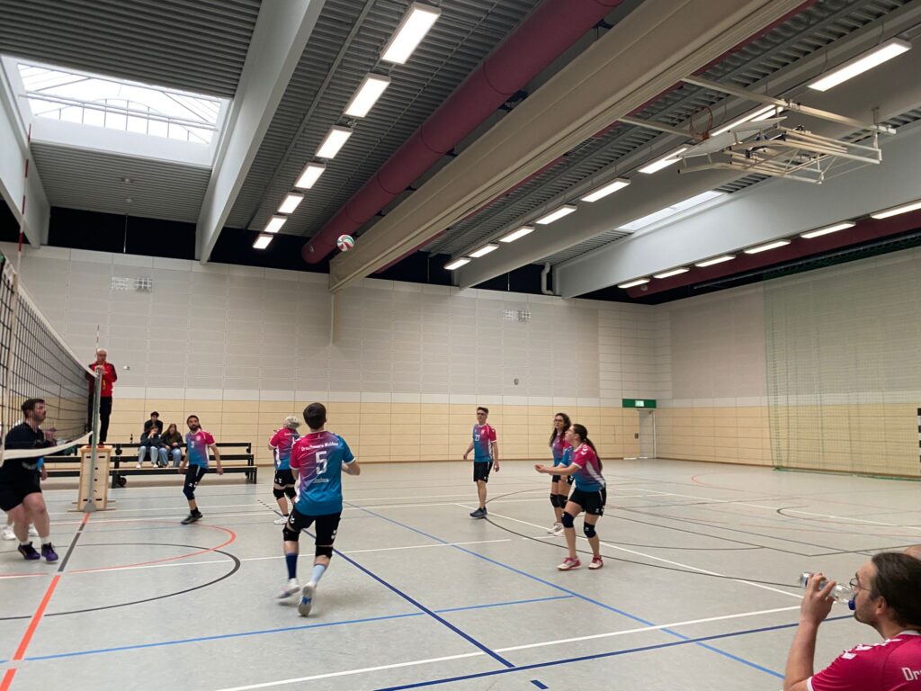 Gleich der erste Punkt steckte den gewohnten Rahmen zwischen den beiden Teams ab. Ein sehr langer erster Ballwechsel wurde schlussendlich von den Waldseern gewonnen, legte aber die Vermutung nahe, dass es, wie quasi immer bei diesen zwei Mannschaften, eine sehr enge und ausgeglichene Kiste werden könnte. Und tatsächlich ging es von 7:7 zu 10:10 weiter zu 14:14. Kein Team konnte sich absetzen, bis Eb an die Angabe kam und nicht mehr wegging. Die nächsten 11 Punkte in Folge holte die TG und gewann den ersten Satz mit 25:14. Was für ein Start, denn auch spielerisch war das eine ansprechende Leistung der Draufhauers. Der nächste Satz gestaltete sich anspruchsvoller, denn Maudach führte mit zwischenzeitlich 5 Punkten. Beim 5:10 gelang es den Waldseern besser ins Spiel zu kommen und als der 16:16 Ausgleich geschafft war zogen die Draufhauers davon. 25:17 hieß das Endergebnis des zweiten Satzes und damit war Teil eins der zu erledigenden Hausaufgaben fast eingetütet. Die darauffolgende Personalrochade bei der TG sorgte dann jedoch für einen leichten Bruch im Spiel. Maudach witterte diese Möglichkeit sofort und spielte nun besser, was mit dem 14:25 Satzgewinn für eben jene belohnt wurde. Tja, der nächste Satz würde alles, oder zumindest einiges, entscheiden.